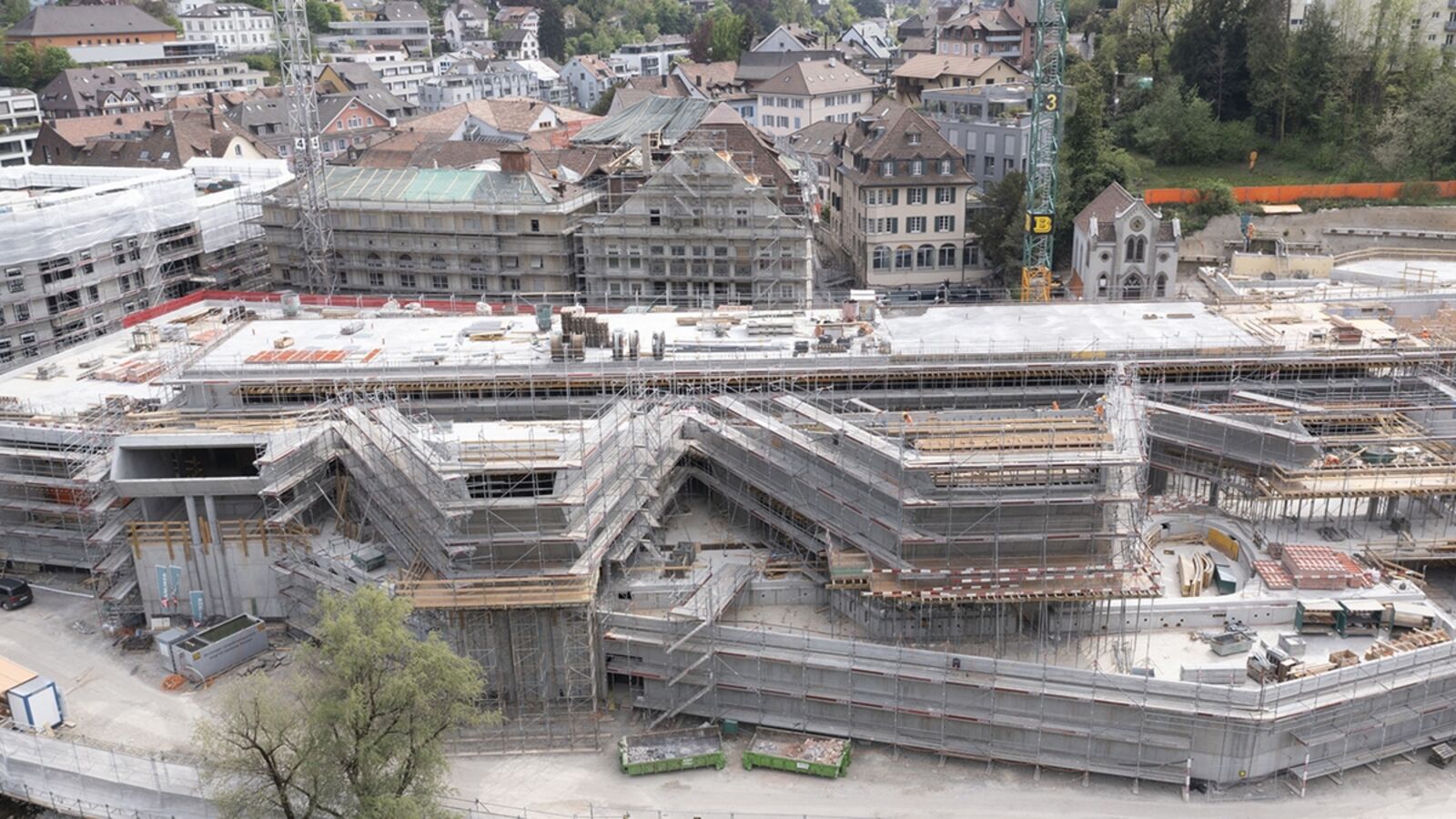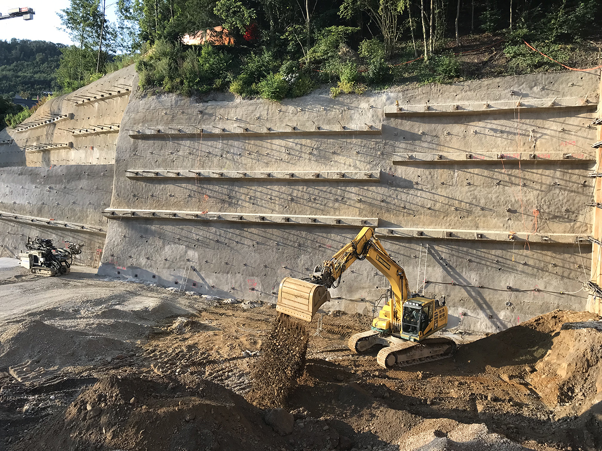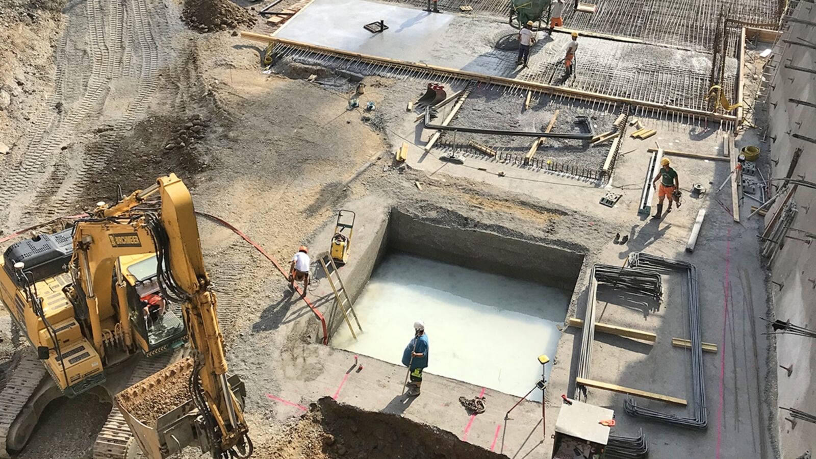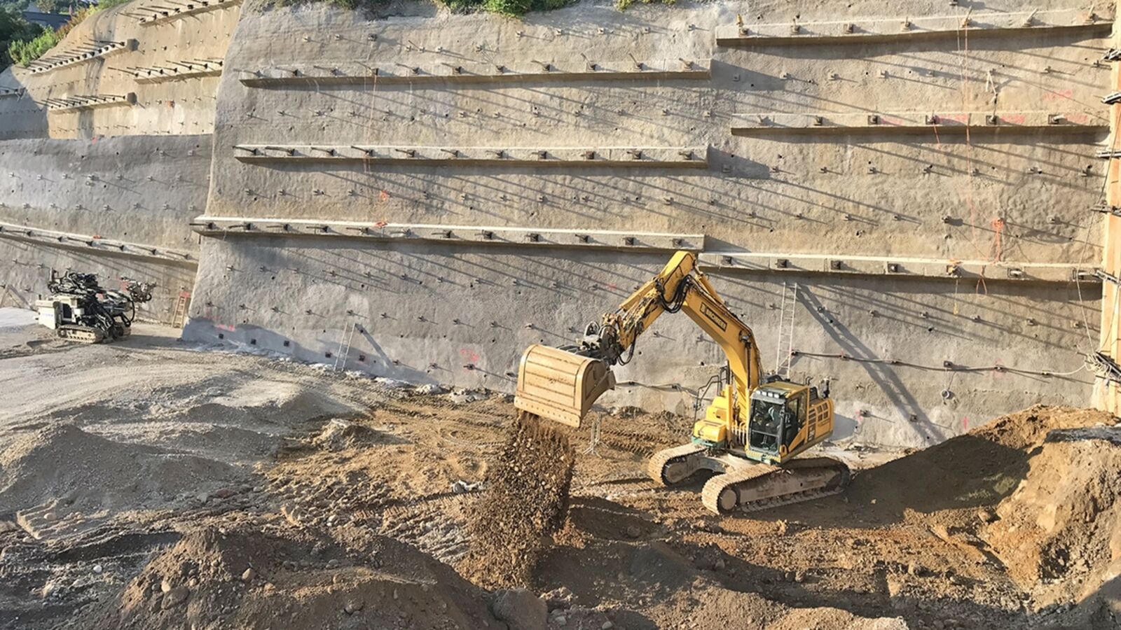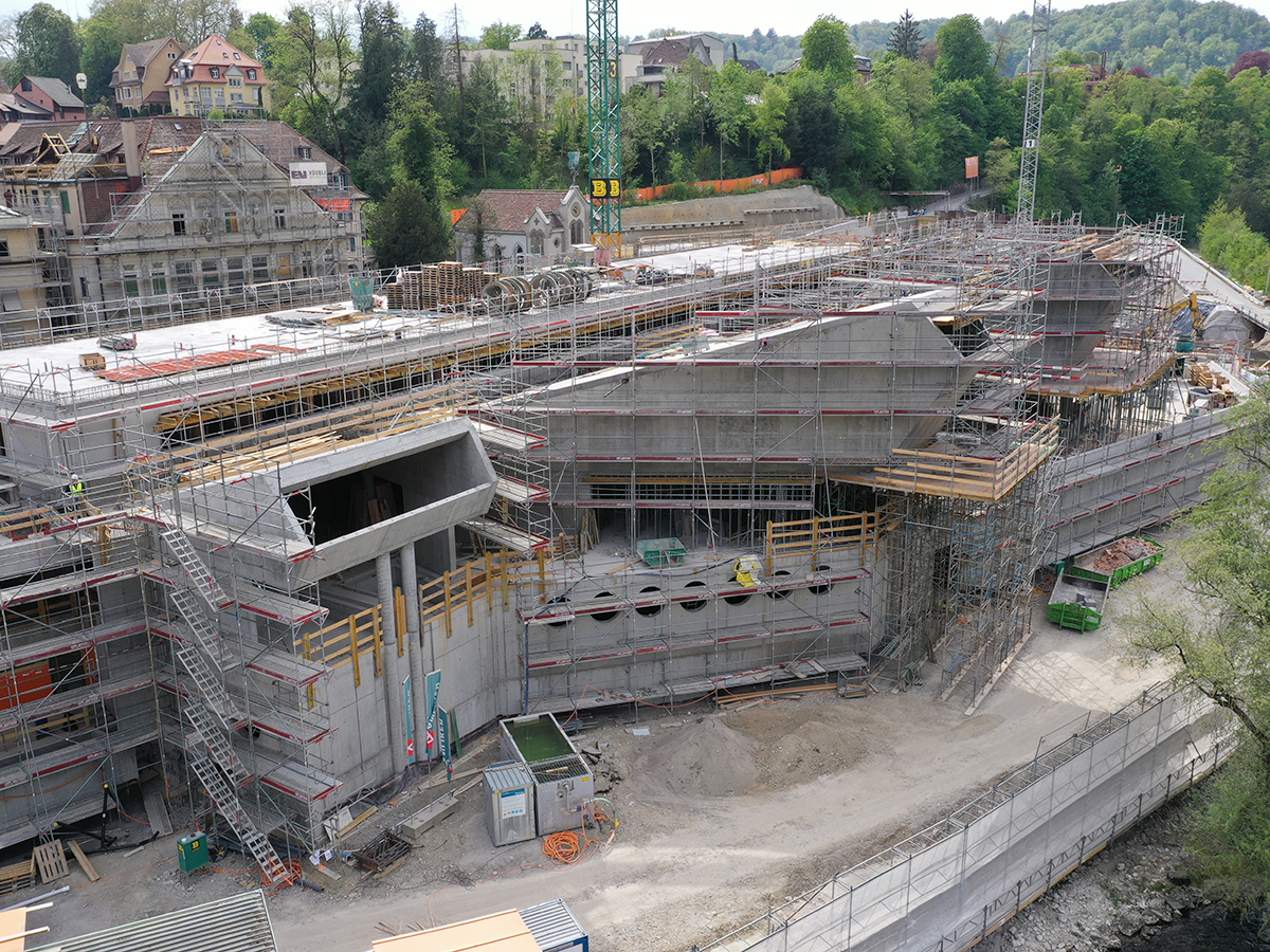 Die Tiefbauarbeiten begannen 2016 mit dem Rückbau der bestehenden Gebäude. Im Frühling 2018 folgten nach dem Rückbau der Tiefgarage die Baugrubensicherung und Fundationen. Total haben wir 60 000 m3 Material ausgehoben. Ständige Begleiter der Arbeiten waren Archäologen und Geologen. Während die Archäologen Relikte der Römerzeit sicherten, stellten die Geologen sicher, dass keine der rund 30 Thermalquellen beschädigt wurde.