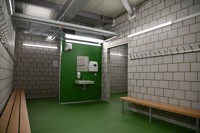 Neubau einer provisorischen Doppelturnhalle als Stahlbau mit einer Fassade aus Sandwichpaneelen. Kopfbau und Bodenplatte Massivbauweise.