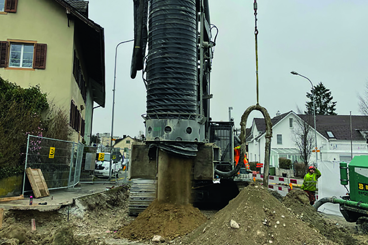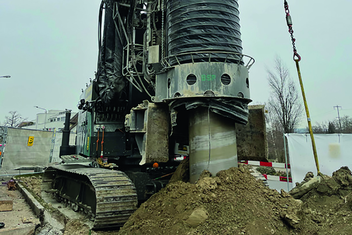 - Hier wurde das Doppelkopfverfahren ø900 gewählt, dadurch wird nach erreichen der Bohrtiefe während des Rückzugs der Bohrausrüstung durch die Bohrschnecke betoniert, der Einbau der Bewehrung erfolgt in einem weiteren Arbeitsschritt