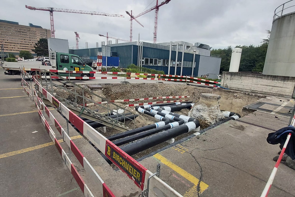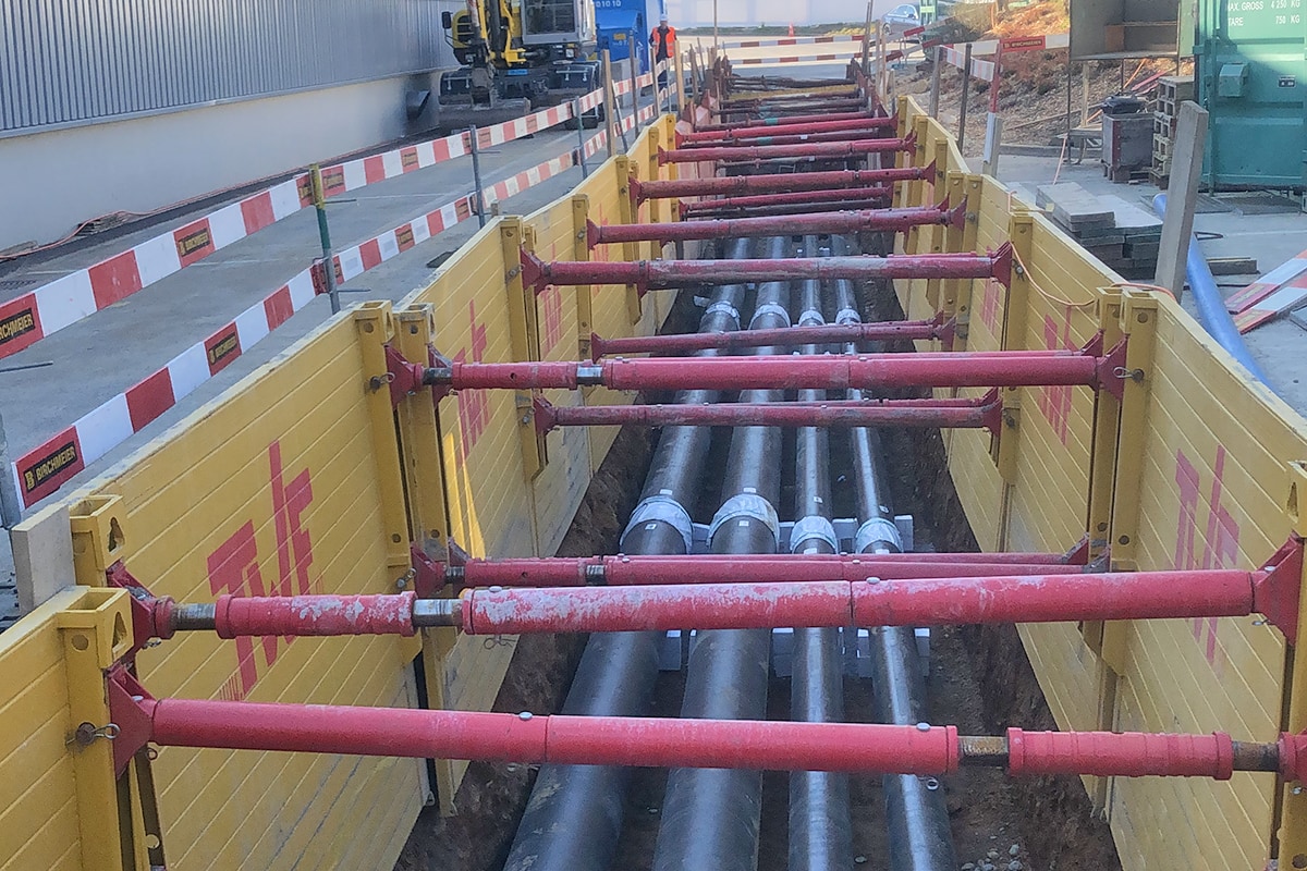 Werkleitungsbau mit komplexer Grabenspriessung, teilweise an drei Orten gleichzeitiges Arbeiten, Koordination mehrerer Unternehmer, Fernwärmetrasse Hauptzuleitung für Neubau KSB