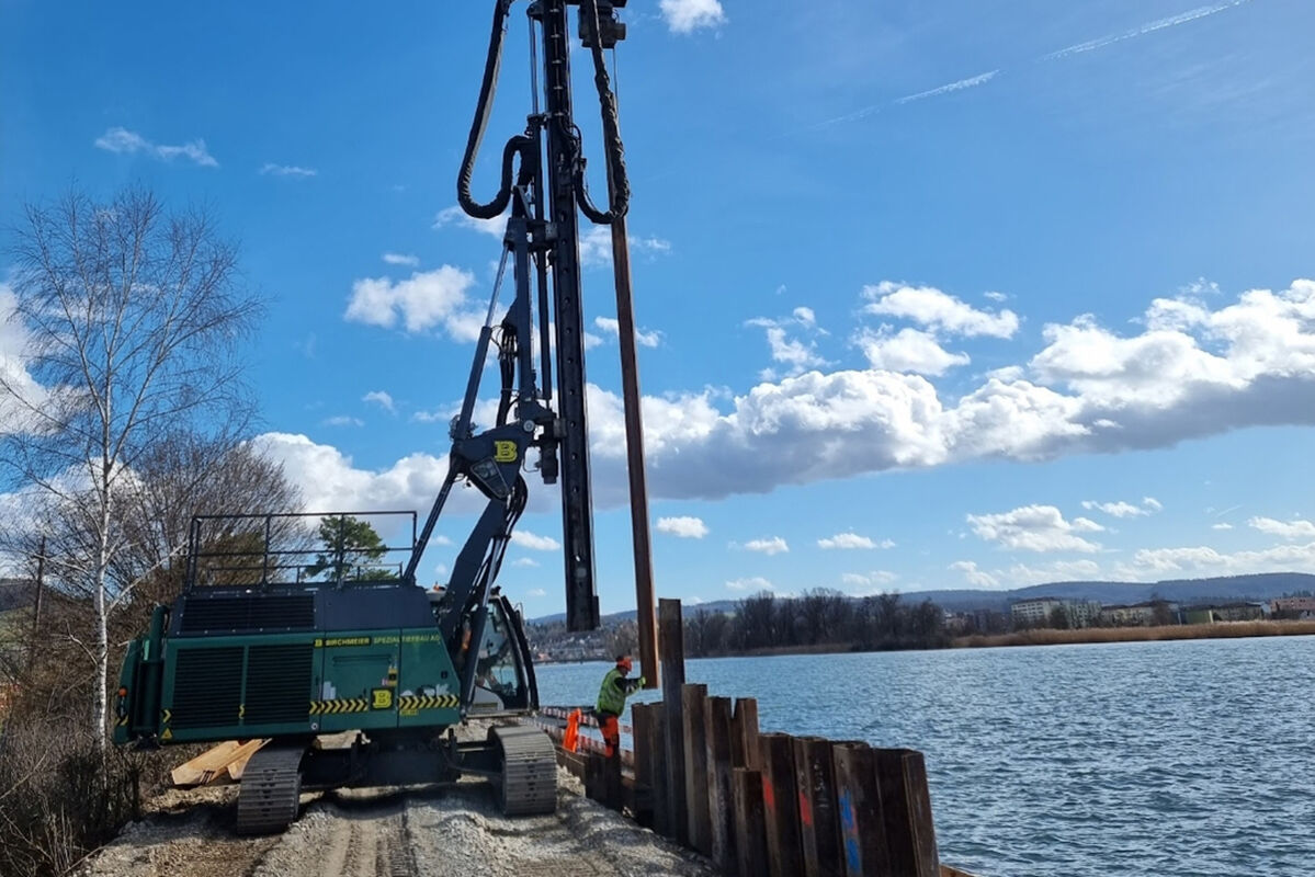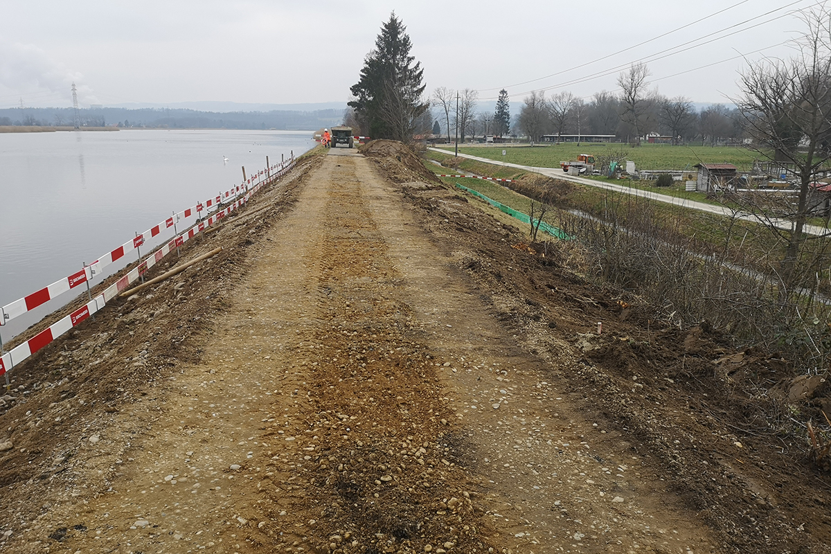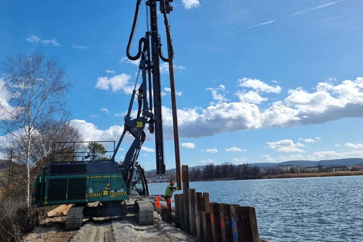 Der rechte Uferdamm des Klingnauer Stausees musste auf einem Teilstück von 150 m zur Ertüchtigung der Dichtigkeit saniert werden. Dazu wurde der alte Belag zurückgebaut, ein Rammplanum erstellt, Spundwände mit einer maximalen Tiefe von 12 m bis auf den Felsuntergrund hineinvibriert und das ursprüngliche Terrain inkl. Belagsarbeiten wiederhergestellt.