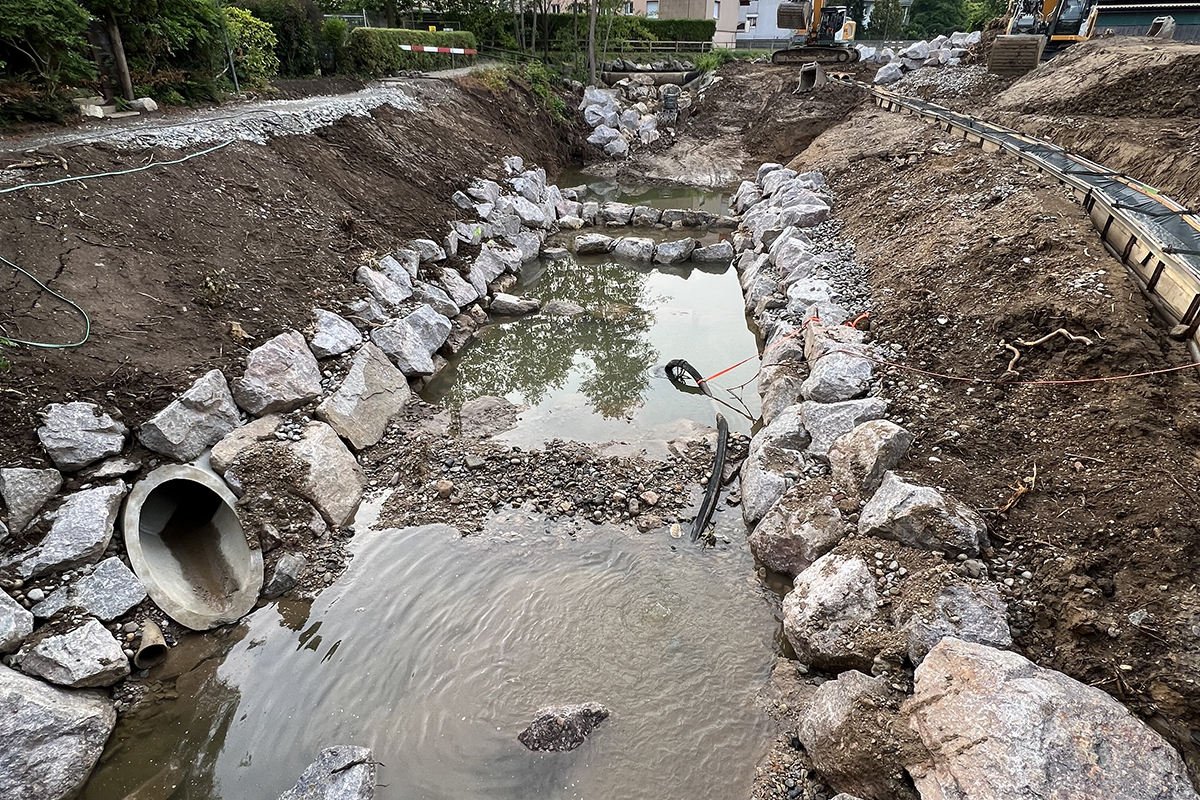 Abbruch Stauwehr, Erstellen einer geschlossenen Blockrampe mit Riegel-Beckenstruktur, Ufersicherung mit Blocksatz, Abbruch und Neubau Kanalisation DN 900 & 1400, Brückenwiderlager erstellen, Entsorgung Neophyten, Abbruch Holzschopf