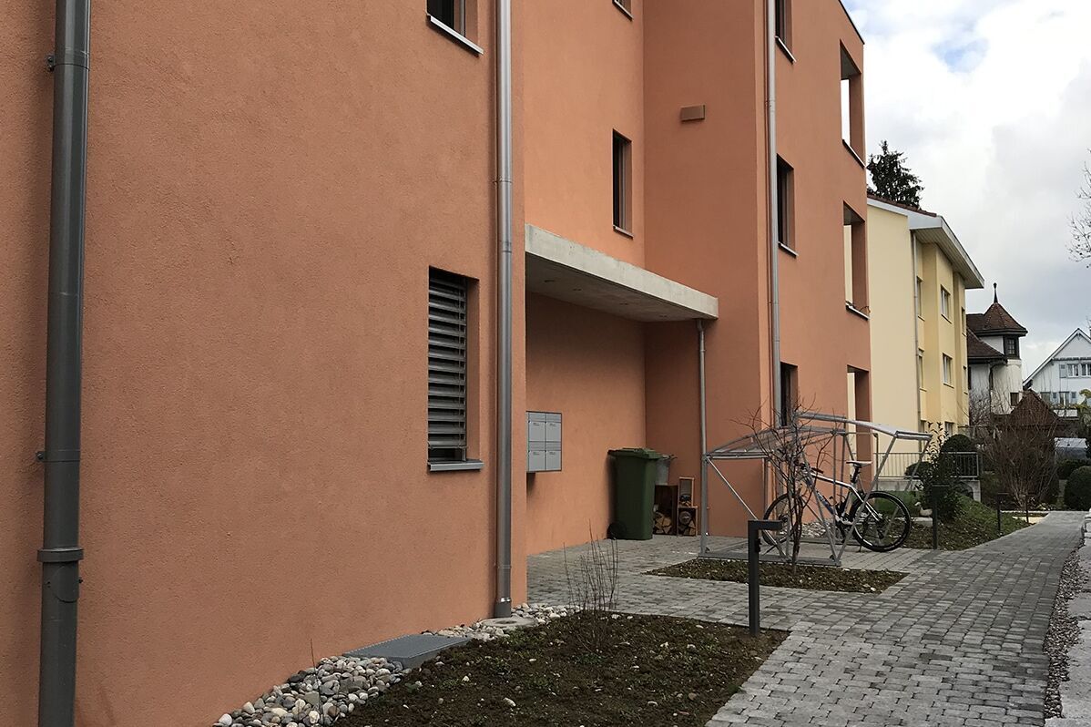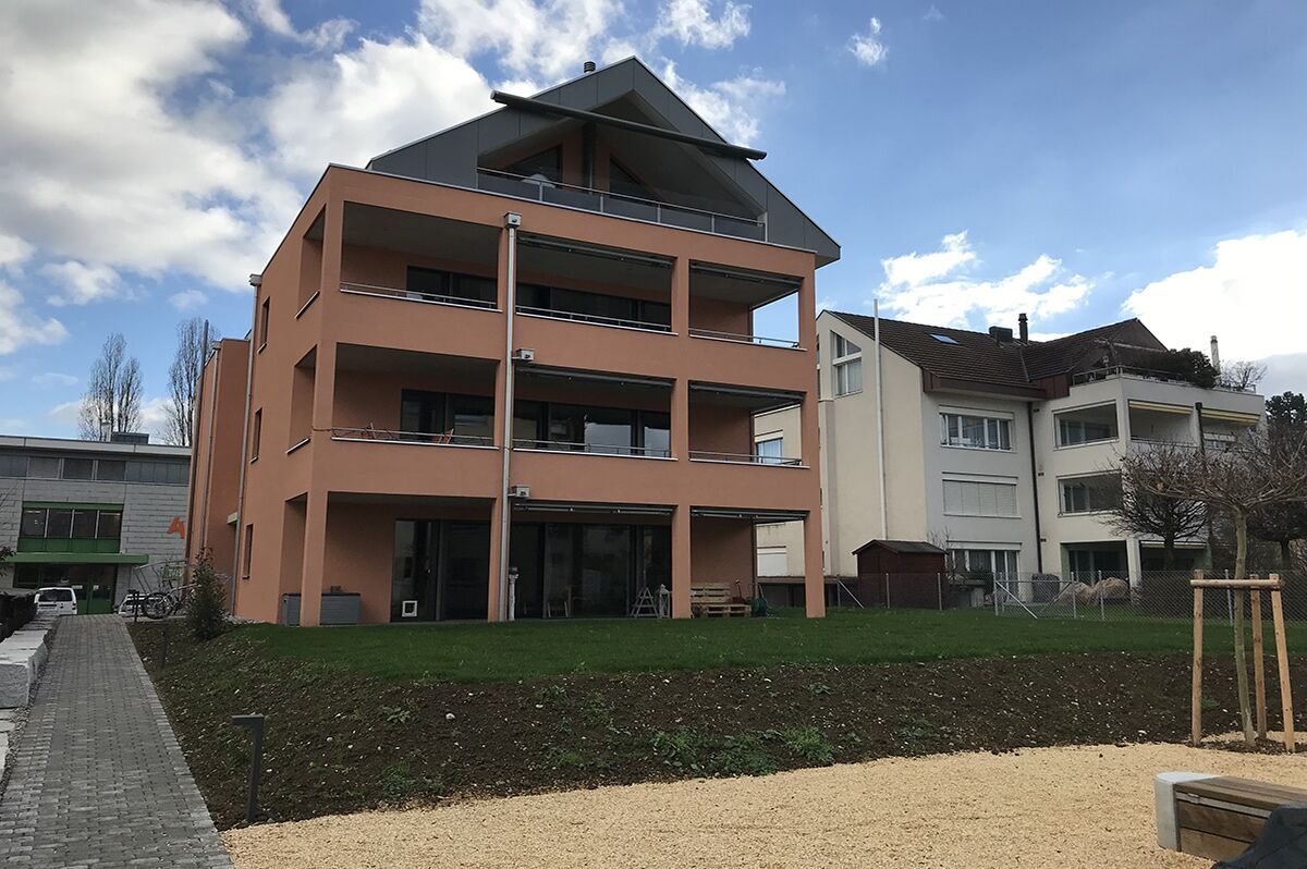 - Neubau eines vierstöckigen Mehrfamilienhauses an bestehende Einstellhalle, Massivbauweise mit Elementdach und gehobenem Ausbaustandard