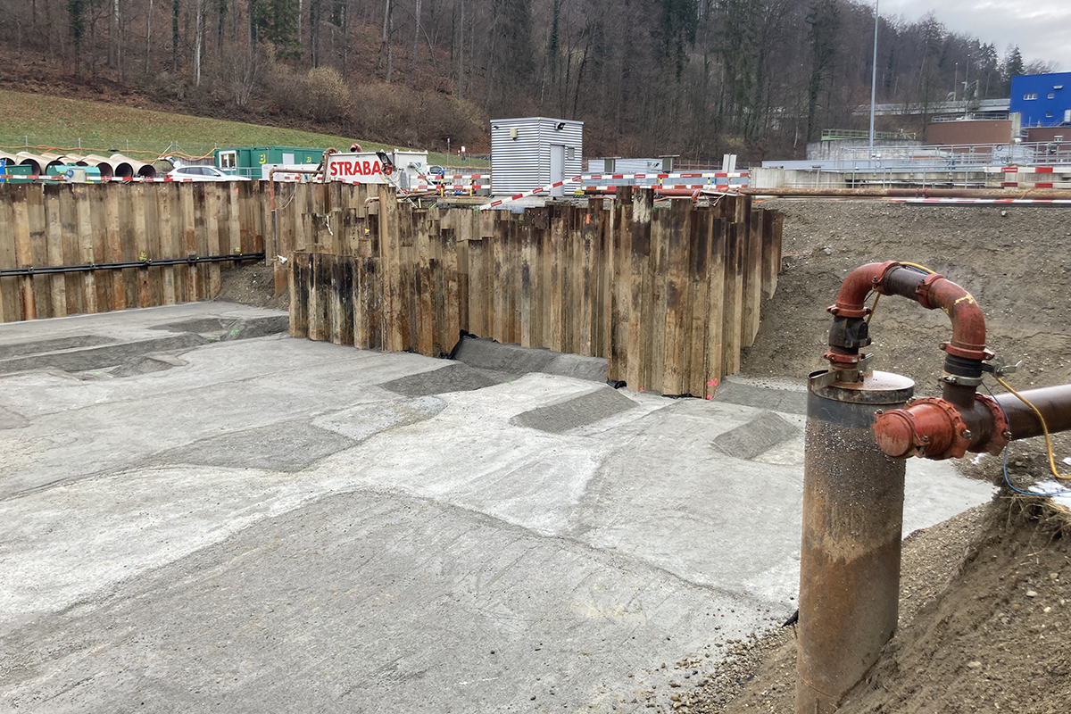 Allgemeine Installationen, Bodenabtrag, Grundwasserabsenkung mit 8 Filterbrunnen Ø 700 mm, während der ganzen Bauzeit, Lockerungsbohrungen für die Spundwände, Baugrubensicherung mittels rückverankerten Spundwänden PU 22, Umleitung Abfluss ARA mittels Ø 800 mm Stahlrohr, Ortsbetonschächte erstellen, Dückerleitung erstellen mit GFK-Rohre Ø 1280 mm, Fundamentaushub, Baugrubensohle Materialaustausch infolge nicht tragfähigem Baugrund, Auffüllung Gebäude, Rückbau Wasserhaltung