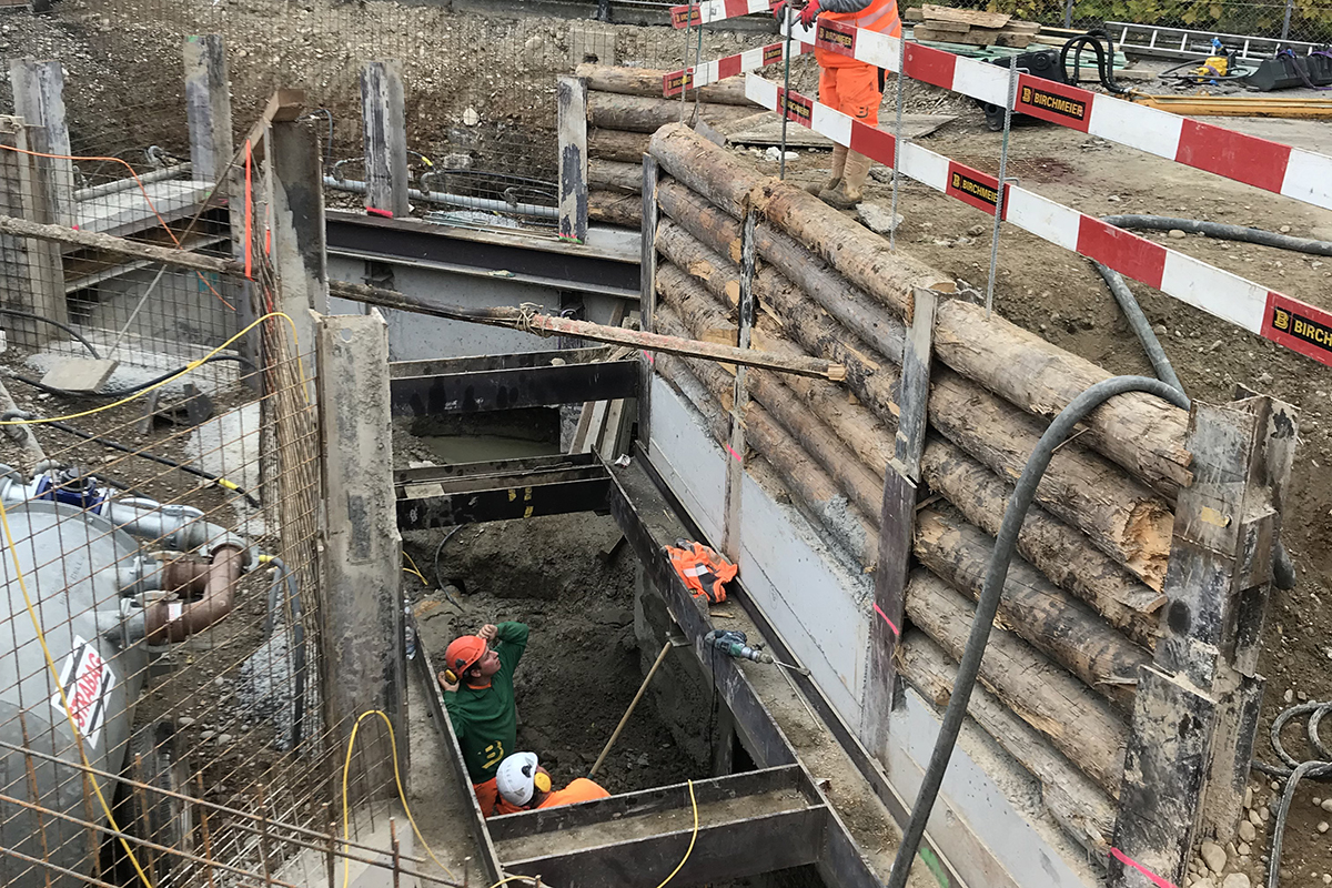 - Zwei überschnittene Bohrpfahlwände im Grundwasser für Ortsbetonschachtbauwerke mit je 36 verrohrten Bohrpfählen à 14 Meter