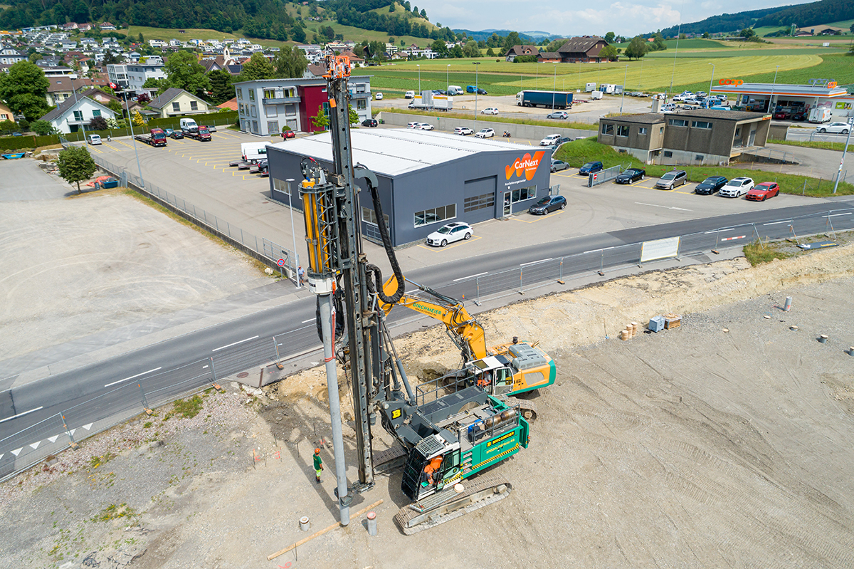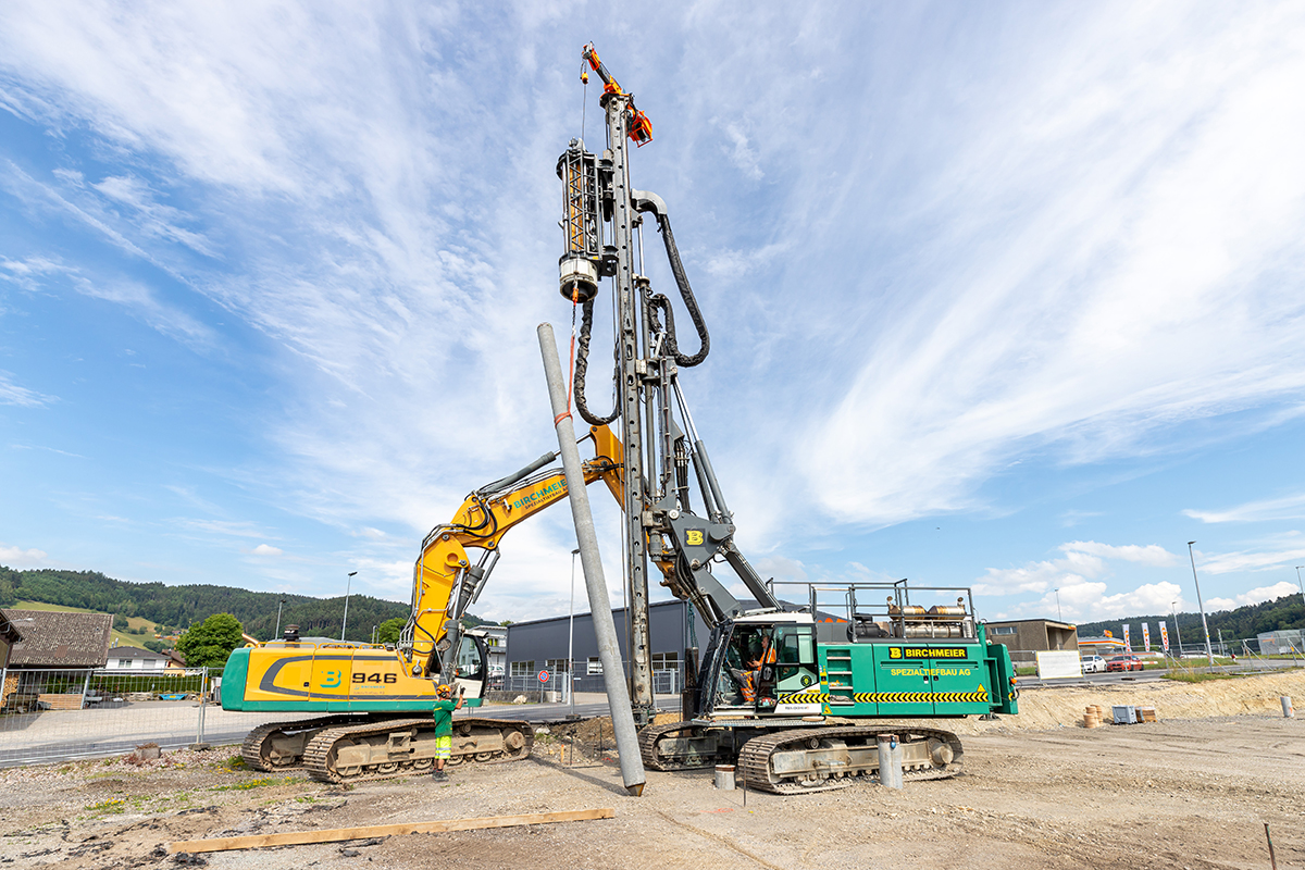 - Über einer ursprünglichen Mülldeponie, bei welcher bis heute stark kontaminiertes Baugrundmaterial vorhanden ist, werden Pfähle als Fundationsträger vom Neubau der Schulanlage FB ABZM erstellt. Aufgrund des stark belasteten und kontaminierten Baugrunds, erarbeitete die Birchmeier Spezialtiefbau AG zusammen mit der Bauherrschaft eine Unternehmervariante, bei welcher eine Pfahlfundation mittels Fertigbeton-Rammpfählen definiert wurde. Durch das definierte Pfahlsystem wird der stark belastete Baugrund nicht mittels eines Durchbohrens an die Oberfläche gefördert, sondern wird seitlich verdrängt. Zusätzlich konnte durch das definierte Pfahlsystem das Risiko einer befürchteter Grundwasserverschmutzung um ein Vielfaches minimiert werden.