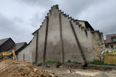 - Sichern des Treppengiebels vom bestehenden, unter Denkmalschutz stehenden Gebäude
