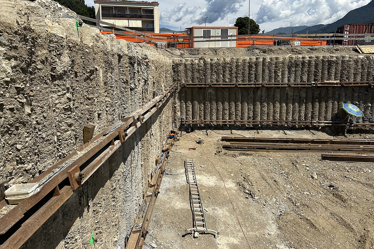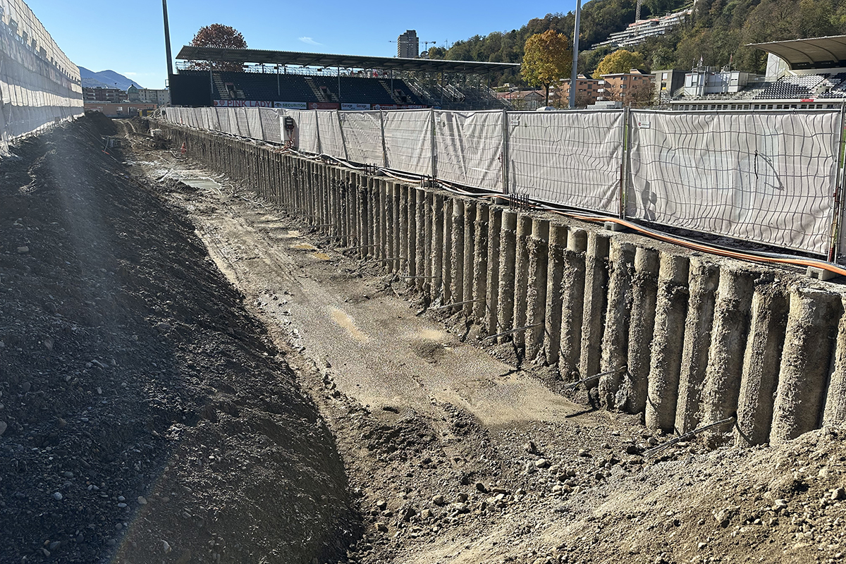 Beim Projekt PSE Polo sportivo e degli eventi in Lugano wird das neue Fussballstadion des FC Lugano realisiert. Die Birchmeier Spezialtiefbau AG ist bei diesem Projekt mit der Ausführung der Spezialtiefbauarbeiten für den Baugrubenabschluss betraut. Ursprünglich war der Baugrubenabschluss mit einer Rühlwand vorgesehen. Dank der Unternehmervariante der Birchmeier Spezialtiefbau AG konnte jedoch eine alternative Lösung mit dem System Pfahlwand umgesetzt werden. Diese Anpassung ermöglichte es, potenzielle Risiken erfolgreich zu minimieren und Terminvorteile zu erzielen.