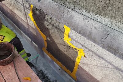 Betoninstandsetzung der bestehenden Brücke, neue Entwässerungsrinnen eingebaut, Oberflächenschutzsystem OS 1 aufgetragen