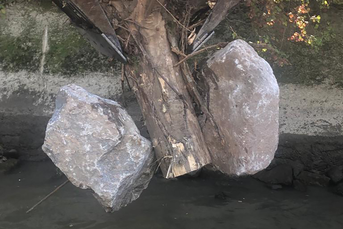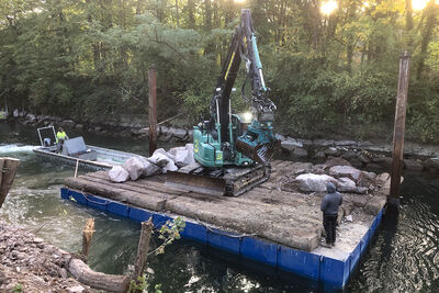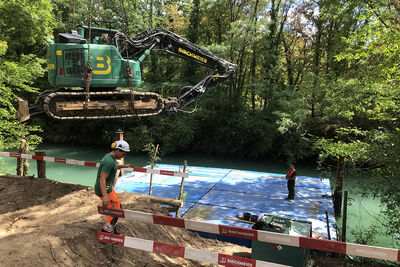 Sanierung des Uferbereichs im Unterwasserkanal des Kraftwerks Windisch auf eine Länge von 600 Meter, damit das Kleinwasserkraftwerk weiterhin zuverlässig seinen Beitrag zur Versorgungssicherheit leisten kann. Abgerutschte Uferverbauungen und unterspülte Fundationen mit Natursteinen und Unterwasserbeton in einer Schlauchschalung sichern. Die Natursteine wurden mit einer Schwimmplattform an den Einbauort transportiert und mit Unterstützung eines Tauchers eingebaut. Weiter wurden mit Natursteinen beschwerte Wurzeln als Unterschlupf für die Fische versetzt.