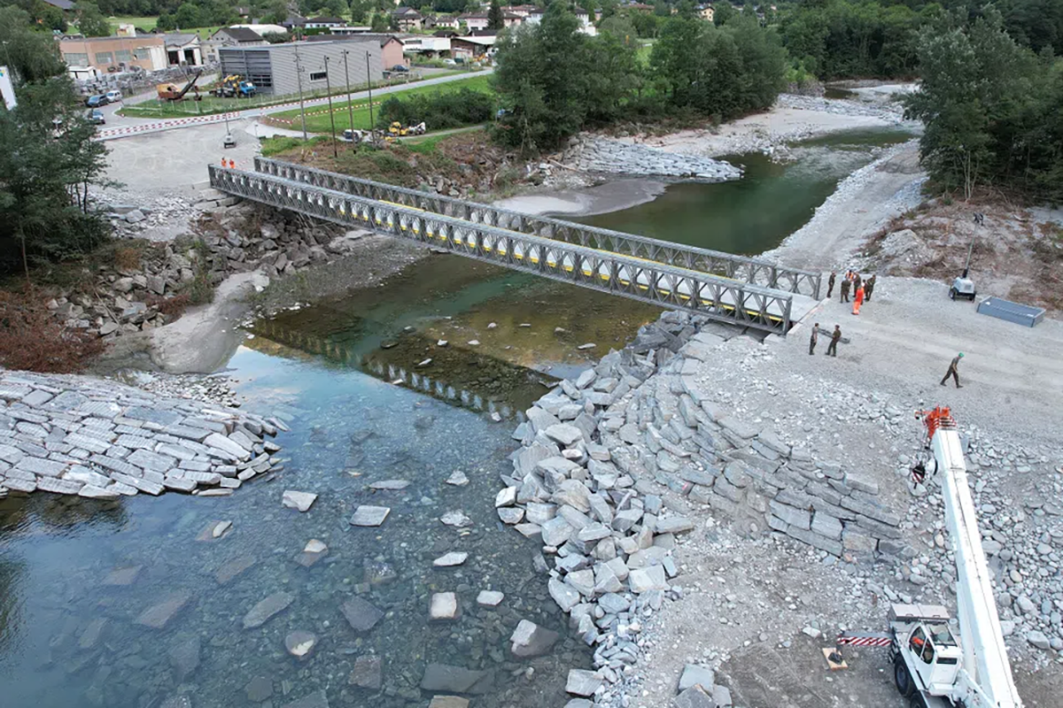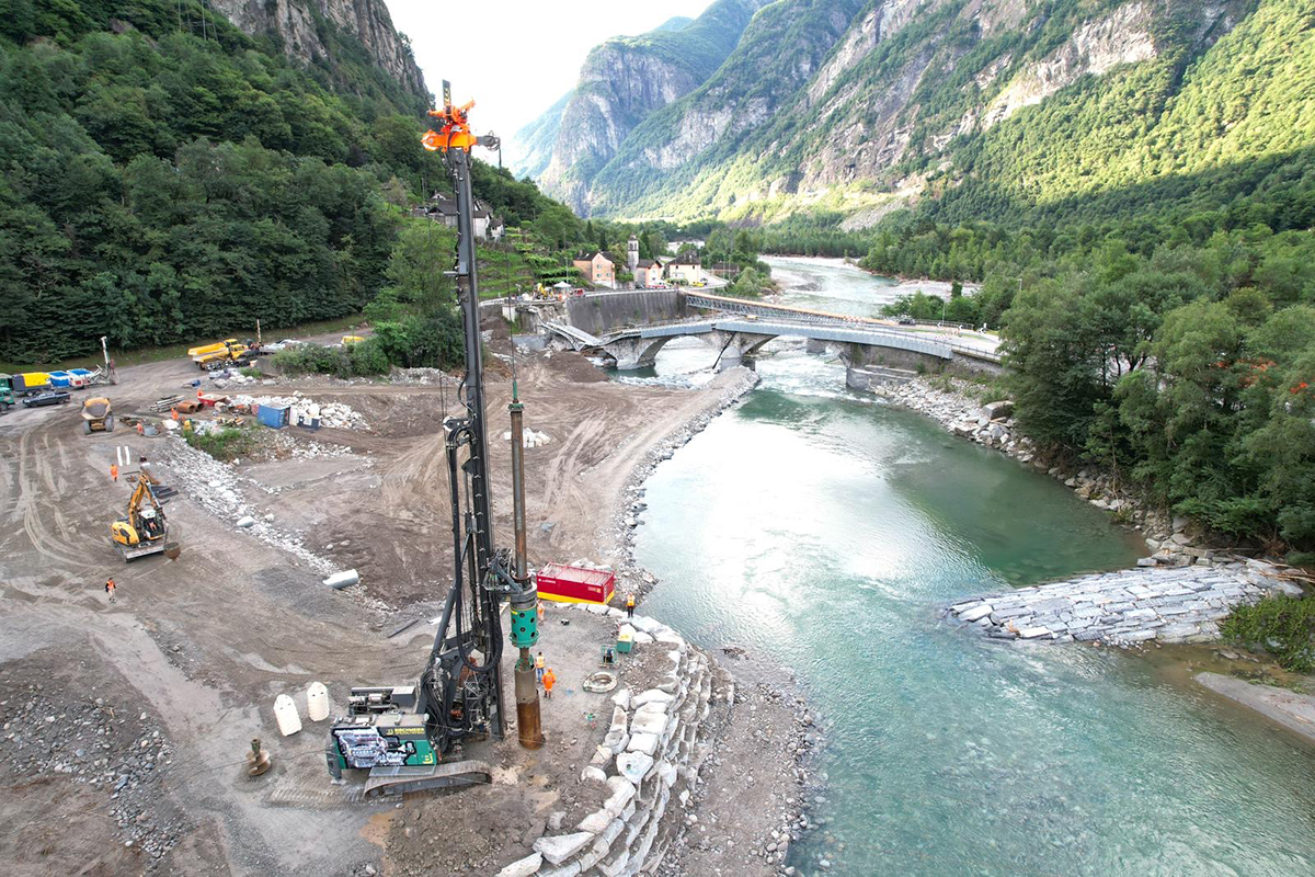 Im Einsatz für den Wiederaufbau in Cevio. Unter der Leitung der Armee wurde die 61 Meter lange und 4,5 Meter breite provisorische Notbrücke errichtet. Wir waren mit dem 120 Tonnen schweren Drehbohrgerät vor Ort. Der Auftrag lautet, Pfähle mit einem Durchmesser von 1,2 Metern und einer Tiefe von 22 Metern für die Fundation der Notbrücke zu erstellen. Es ist eine kurzfristige und herausfordernde Aufgabe.