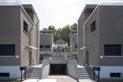 Neubau von vier Einfamilienhäuser (Eigentum) mit Autoeinstellhalle. Ausführung Holzbau mit Flachdach.