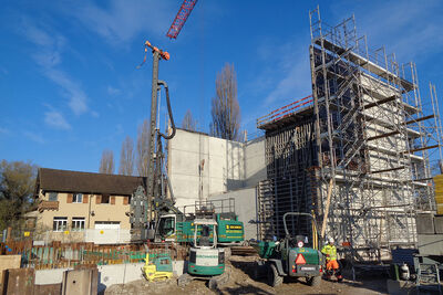 - Vertikaler Baugrubenabschluss mit Spundwänden (1200 m²) inkl. Ausfachung und Rückverankerung in Baugrube